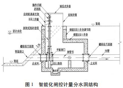 分水洞采用了一種封閉式啟閉閘集成閘井預(yù)制件,包括頂節(jié)、標準節(jié)和底座。與傳統(tǒng)現(xiàn)場澆筑的方式相比,集成閘井采用防水設(shè)計,并且安裝更加方便快捷,很大程度上提高了安裝效率,節(jié)約成本。采用事先預(yù)制好的啟閉閘支座、啟閉機機座,保證了設(shè)備的安裝精度,提高了設(shè)備運行的穩(wěn)定性,減少了設(shè)備的后期維護。分水洞結(jié)構(gòu)除了預(yù)制混凝土外,還可考慮采用玻璃鋼或工程塑料整體制作,用標準節(jié)調(diào)節(jié)高度。分水洞結(jié)構(gòu)設(shè)計見圖 1。