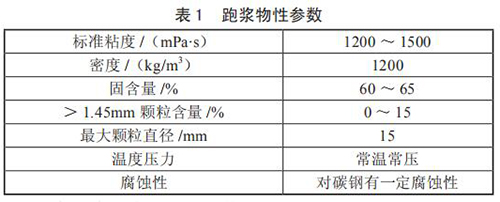 對(duì)跑漿進(jìn)行分析后發(fā)現(xiàn),跑漿是一種由煤漿和一些雜質(zhì)混合而成的半流體物質(zhì),當(dāng)管道蒸汽流量計(jì)使用煤倉中煤堆中上部煤時(shí),由于煤質(zhì)較好,跑漿中小煤塊極少,性質(zhì)同正常煤漿,只是固含量稍高;而使用煤堆底部的煤時(shí),煤質(zhì)差管道蒸汽流量計(jì)研磨不充分,跑漿中含有約 15% 的小煤塊,分析后的跑漿物質(zhì)參數(shù)如表 1 所示。