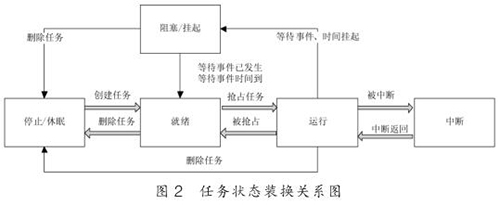 μC/OS-III 中的每一個任務都是無限循環(huán)的 。 每個任務會有五種狀態(tài),并且處于五種狀態(tài)之一。 這五種狀態(tài)分別是:睡眠態(tài)、就緒態(tài)、運行態(tài)、等待態(tài)以及中斷服務態(tài)。 睡眠態(tài)是指任務只是以代碼的形式存在于程序空間, 并未交給操作系統(tǒng)進行管理; 就緒態(tài)是指系統(tǒng)為任務配備了任務控制塊且在任務就緒表中進行了就緒登記,使任務具備了運行的充分條件;運行態(tài)是指處于就緒態(tài)的任務如果經(jīng)調(diào)度器判斷獲得了 CPU 的使用權時的狀態(tài);等待態(tài)則是正在運行的任務,需要等待一段時間或需要等待一個事件發(fā)生再運行; 中斷服務狀態(tài)是指一個正在運行的任務一旦響應中斷申請就會中止運行而去執(zhí)行中斷服務程序。這五種狀態(tài)在系統(tǒng)管理下的轉(zhuǎn)換關系由圖 2 所示。