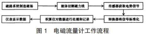 智能渦輪流量計的產生主要是基于法拉*電磁感應定律。在智能渦輪流量計的應用中,磁路系統(tǒng)會在流量計運行過程中逐步出現(xiàn)直流磁場與交流磁場,該磁場的產生為后期的測量提供了良好的前提條件,營造了測量所需的磁場環(huán)境,因此,在智能渦輪流量計應用時,一旦被測液體在導管中經過該磁場環(huán)境時,必然會產生一定的切割磁力線運動,在這種情況下,電極傳感器就會發(fā)揮其作用,將導管內的流量轉換為感應電勢信號,隨后此轉換形成的信號逐步被傳遞給轉換器。而轉換器更是可以將所獲得的流量信號等加以處理,通過分析、對比等,轉換器會將該信號變?yōu)闃藴市盘?,隨后將該信號輸出給積算儀,進一步進行信號的處理,這些處理以后的信號*終會在智能渦輪流量計的儀表中顯示,呈現(xiàn)*終的流量測量結果,其基本的流程如圖 1 所示。