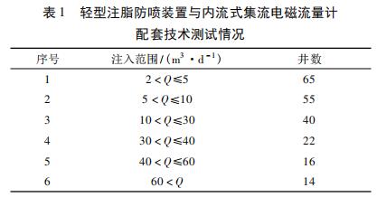 在實(shí)際應(yīng)用中,使用輕型注脂防噴裝置與內(nèi)流式集流智能型渦輪流量計(jì)配套技術(shù)對(duì)喇叭口在射孔層上注聚井進(jìn)行測(cè)試。輕型注脂防噴裝置與內(nèi)流式集流智能型渦輪流量計(jì)配套技術(shù)施工工藝參見(jiàn)文獻(xiàn),測(cè)試情況見(jiàn)表 1 所示,低注入量井( ≤10 m3 /d) 占到 56. 60% 。