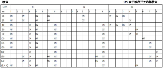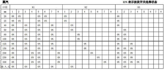 (4)標況流量計算公式,單位 t/h:四、AMPKP09A01 放大板波段開關調(diào)整參照表五、AMPSW10A01 放大板波段開關調(diào)整參照表RG=1-F 調(diào)放大器增益,由 1 至 F 依次增大(常用 4-8);RS=1-F 調(diào)觸發(fā)靈敏度,由 1 至 F 依次提高(常用 4-8)不同口徑和介質(zhì)開關選擇參見附表。并根據(jù)實際信號先調(diào)整 K2 和 K3 擴展頻帶,必要時調(diào)整 K1 電荷放大器增益以上表值僅供參考,實際使用中因液體粘度和氣體密度不同應在此值附近調(diào)整,頻率低時可將 K3 向大口徑方向調(diào)一至三檔。頻率高時可將 K2 向小口徑方向調(diào)一至三檔。訂貨須知及選型樣譜一.尊敬的用戶,當您要選用本公司產(chǎn)品時,請仔細閱讀選型樣本,并做好以下工作:1.認真核對被測介質(zhì)的工況條件:溫度、壓力、管徑等工藝參數(shù)。2.認真核對被測介質(zhì)的使用流量范圍,特別是*小流量值以*終確定使用儀表的口徑及配管參數(shù)。3.確定儀表的安裝地點,保證直管段,并為儀表的安裝維護創(chuàng)造好的環(huán)境條件。4.填好訂貨咨詢單,見附表三二.渦街流量儀表選型表(符合 JB/T9294-1999 標準)1.傳感器選型表上一篇:污水流量計的種類