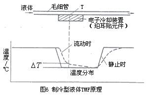液體用tmf 在20世紀(jì)90年代初中期開始發(fā)展并在工業(yè)生產(chǎn)中應(yīng)用,但當(dāng)前主要為微小流量儀表。有消耗功率測(cè)量法的熱分布式tmf和利用珀?duì)柼? peltier)致冷元件在檢測(cè)部位致冷(即附加熱)的tmf。后者的測(cè)量原理如圖6所示,流量傳感器由測(cè)量毛細(xì)管、電子冷卻裝置(珀?duì)柼?和3各溫度檢出件組成。測(cè)量管和致冷元件接觸,無液體流動(dòng)時(shí)冷卻到某一溫度時(shí),兩者溫度相等;液體流動(dòng)時(shí)致冷元件附近測(cè)量毛細(xì)管溫度上升,如虛線所示分布,測(cè)量溫度檢測(cè)點(diǎn)的兩者溫度差以求的流量。