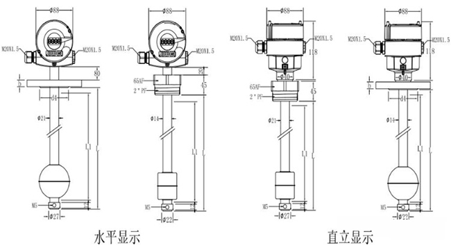 為更直觀地給用戶展現浮球式液位計的規(guī)格,請參考兩種浮球式液位計水平顯示以及直立顯示的不同規(guī)格尺寸,如下圖所示: