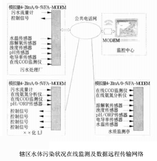 本文介紹的水體污染狀況在線監(jiān)測及數(shù)據(jù)遠(yuǎn)程傳輸網(wǎng)絡(luò)可以連續(xù)、自動監(jiān)測排污口的污水流量和水質(zhì)參數(shù),既可以分別顯示污水流量的瞬時值/日平均值/月平均值、pH/溶解氧/電導(dǎo)率/濁度/水溫/COD/TOC/NH4-N/**3-N等常規(guī)參數(shù),也可以實(shí)時計(jì)算污染物排放總量并經(jīng)公共通信網(wǎng)絡(luò)(電話線路)傳輸至區(qū)(縣)、市級的監(jiān)控中心,在轄區(qū)的電子地圖(GIS)上動態(tài)顯示各排污口的*新數(shù)據(jù),是環(huán)保、市政、水利等監(jiān)理部門實(shí)時觀測轄區(qū)水質(zhì)變化情況的現(xiàn)代化管理工具。系統(tǒng)組成如下: