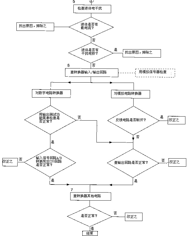 先在管系和流量傳感器內(nèi)通水,靜止無流動(dòng)狀態(tài)下將轉(zhuǎn)換器兩信號(hào)端子和功能地或保護(hù)地端子短路,觀察轉(zhuǎn)換器輸出信號(hào)足否到零。若能到零,則可初步判斷故障在轉(zhuǎn)換之前而不在轉(zhuǎn)換器本身及后位儀表,下一步可先重點(diǎn)檢查連接電纜和傳感器(即流程圖*2項(xiàng));若不能到零,則檢查重心應(yīng)在轉(zhuǎn)換器和后位儀表(即流程圖*3、4、6、7項(xiàng))。