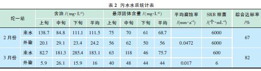 2011年2月坨一站來水含油平均183.1mg/L,外輸含油平均16mg/L,懸浮固體平均8.3mg/L,平均腐蝕率0.017mm/a,SRB 細(xì)菌平均6個/mL。只有懸浮固體含量超標(biāo)。